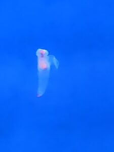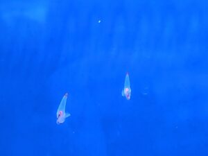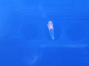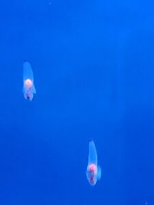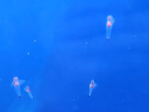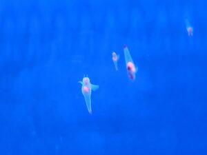 貝殻を持たない貝の仲間で、日本名は「ハダカカメガイ」。一般に「クリオネ」と呼ばれることが多い。北極圏やその周辺といった低水温の海域に生息しており、翼のような器官「翼足(よくそく)」を羽ばたかせ、海中を漂いながら生活します。