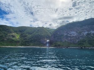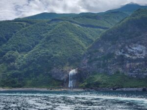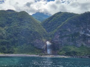 知床の山々から流れてきた地下水が断崖の途中で染み出し、海へと流れ落ちている滝で、シトシト流れ落ちる様子から「乙女の涙」とも呼ばれています。