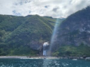 カムイワッカ川の水が直接、オホーツク海に落下しています。落差は約30メートル。幅広の姿形を持つ。陸路で近づくことは困難。落水が硫黄などを含む強い酸性であるため、河口付近は岩場に藻がほとんど生えず、化学反応で海水がエメラルドグリーンになっています。