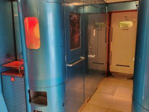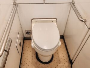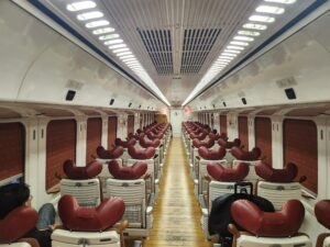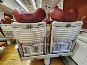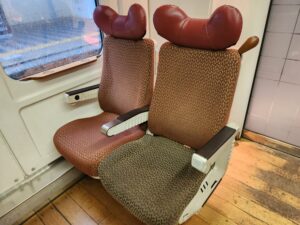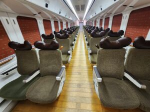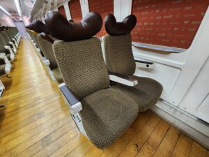 専用モケットシートと本革製のヘッドレストは心地よい座り心地。木製床で落ち着いた雰囲気。