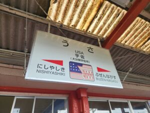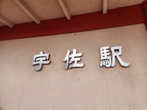 大分県宇佐市大字岩崎にあるJR九州日豊本線の駅。当駅と西屋敷駅の間が、旧豊前国と旧豊後国の境界に当たる。宇佐神社の最寄り駅。2016年1月に新調された駅名標は、青地に赤色で宇佐神社を描いたものであるが、アメリカ合衆国の略称の「USA」と同じであることに因んで、遠目ではアメリカ国旗に見えるようにデザインされています。