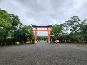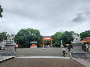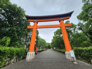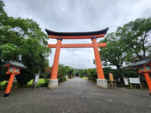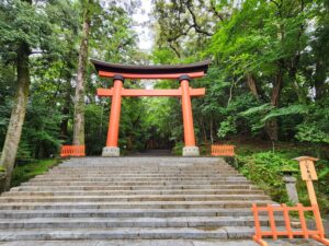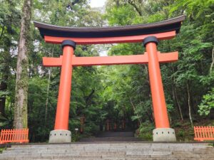境内にはたくさんの鳥居がありますが、宇佐神社の鳥居の特徴として、屋根の部分(笠木)がそり上がっており、額束がなく、柱の上部に黒い台輪が付いています。これは、宇佐神宮独自のもので、境内のあるほとんどの鳥居がこの様式になっています。