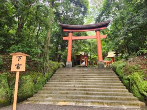 嵯峨天皇の弘仁年間(810年代)勅願によって創建され、上宮の御分身をご鎮祭になったことがきっかけで、八幡大神様・比売大神様・神功皇后様は上下御両宮のご鎮座となりました。古くから日常の祭祀には、特に国民一般の祈願や報賽(ほうさい)が行われてきました。農業や漁業などの一般産業の発展を守る神様として祀られています。
