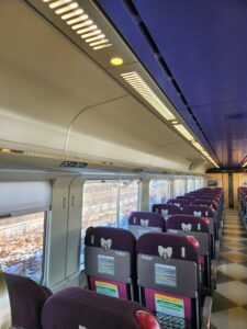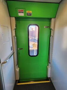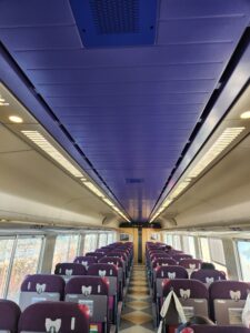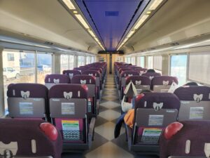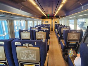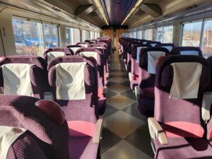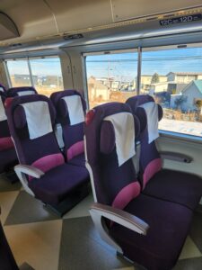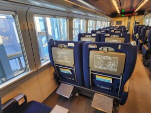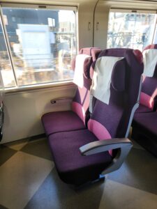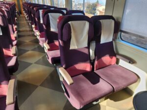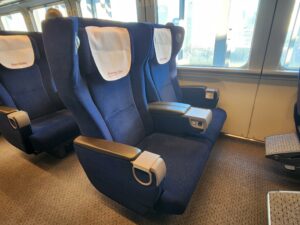 従来の普通車よりも座席幅を広げ、背もたれを高くし、上下可動式枕、ドリンクホルダー、チケットホルダーが設置されています。