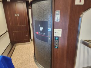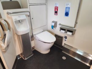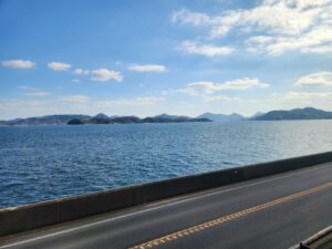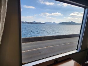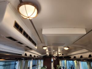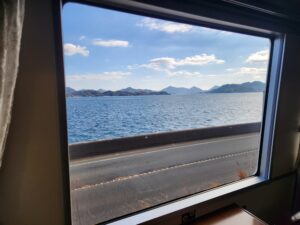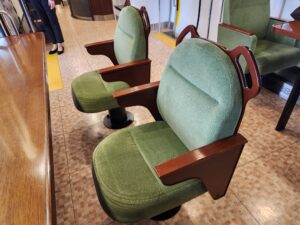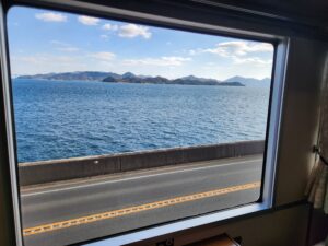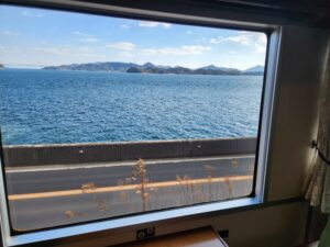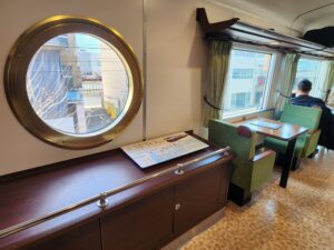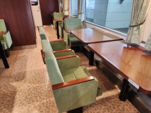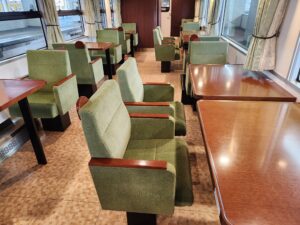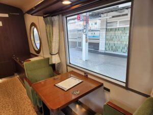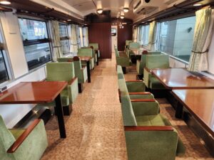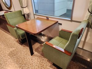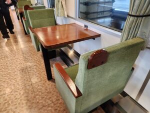 2号車・・・尾道の石畳と瀬戸内の山の新緑を表現したクリーンな印象。車窓を向いたカウンター席と、ゆったり向かい合える2人掛けのテーブルがあります。緑色の窓を向いている座席は全て瀬戸内海側になります。