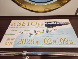列車名「エトセトラ」という言葉は、ラテン語で「その他いろいろ。等々。・・・など」という意味があり、「えっと」は、広島弁で、「たくさんの」「多くの」という意味ももっています。「エトセトラ」で行く旅は、多くの瀬戸内の魅力を感じることができる、自分だけ、自分たちだけの自由な時間を愉しむ旅。エトセトラのロゴマークは、人・街・食・伝統・風習などの様々な思いが、ひとつのレールで繋がり、また違う地域を訪れることで、さらに大きな繋がりを持つ。そんな思いを、「et SETO ra」の文字が繋がることで表現されています。広島駅~福山駅間を呉線・山陽本線経由で運行する臨時快速列車。
