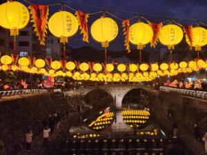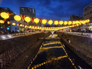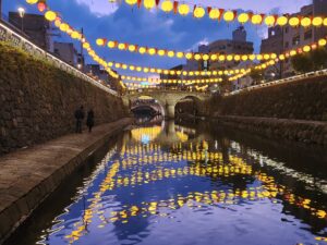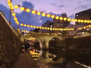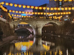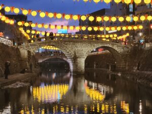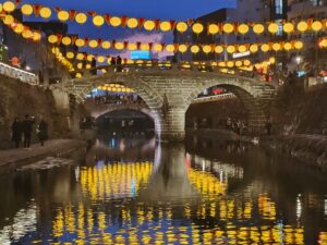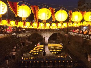 長崎市で旧正月(春節)を祝う冬の最大イベント。2026年は2月6日~23日まで開催。約1万5千個の中国ランタン(中国提灯)が街を彩り、中華街や湊公園を中心に皇帝パレード、龍踊り、変面ショーなどが行われています。街を彩るランタンは眼鏡橋周辺が黄色、中華街ではピンク・・・会場により様々な限定カラーがあります。