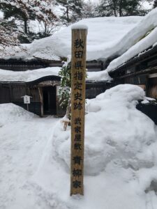 青柳家は芦名氏譜代の侍でしたが、芦名氏断絶後佐竹北家の組下となりました。道路に面して「のぞき窓」のついた黒塗りのささら子塀がめぐり、1860年(万延元年)大工棟梁・柴田岩太郎銘の矢板にある薬医門があります。門から入って北側に井戸屋形、米蔵などがあり、それに近く正玄関、その北側に脇玄関があり客の格式・身分によりその使用を分けていました。武家屋敷の建築様式を今に伝えるこの家屋は寄棟萱葺き屋根の主屋、薬医門、蔵、塀など全体として非常にまとまっています。